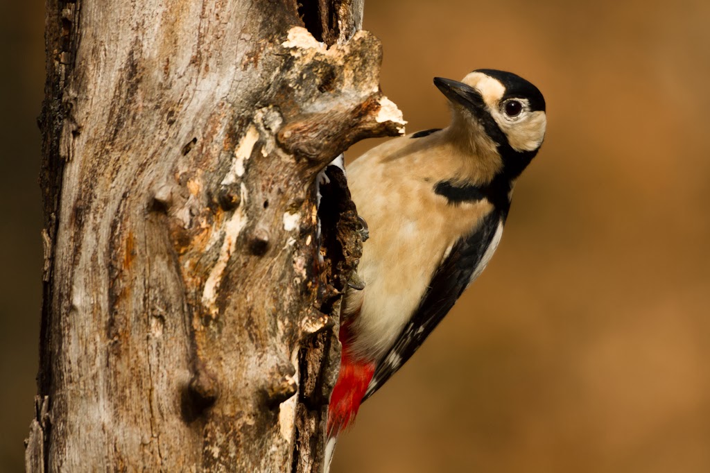 Aun en el invierno, el Pico Picapinos escoge una rama seca o un tronco hueco sin corteza y, bien apoyado en sus tarsos, lo martillea vigorosamente con golpes rápidos y rítmicos, en series de doce, que hacen resonar la madera de una forma extraña. Otros prefieren objetos metálicos para esta manifestación sonora. Este pico excava él mismo su nido, pero utiliza a veces una cavidad ya existente, el agujero viejo de otro pico o caja anidera. Tras la época de la cría los Picos Picapinos se dispersan. El Pico Picapinos habita zonas arboladas de muy diversos tipos, tanto de frondosas como de coníferas, incluso en la alta montaña. Come en los árboles con más frecuencia que el Pito Real, que prefiere hacerlo en tierra. Debido a esta alimentación, y aunque en España es ave principalmente sedentaria, en el norte de su área de cría se comporta como típica ave irruptora, y así, en los inviernos crudos, en los que falta totalmente el alimento en esas zonas, se producen desplazamientos masivos, que pueden afectar a miles de aves que invaden regiones más meridionales. Identificación: Negro con parches y manchas blancas; el macho tiene carmesí en la cabeza; los jóvenes, píleoParte superior de la cabeza (Capirote). rojo; ambos sexos y en todas las edades tienen rojo debajo de la cola; fácilmente diferenciable del Pico Menor por su tamaño más grande. Nidificación: Ambos sexos excavan agujero en árbol, generalmente a 3 ó 4 metros de altura; nido sin material, excepto pocas virutas; a veces usan cajas anideras; pone, de mayo a junio, de 4 a 7 huevos blanco lustroso; la incubación, que dura unos 16 días, la realiza principalmente la hembra; los pollos, alimentados por ambos padres, abandonan el nido sobre los 20 días. Alimentación: Larvas de escarabajos, avispas y polillas; algunas arañas; ocasionalmente pollos de aves robados de los nidos; pequeña dieta vegetal. Hábitat: Bosques.